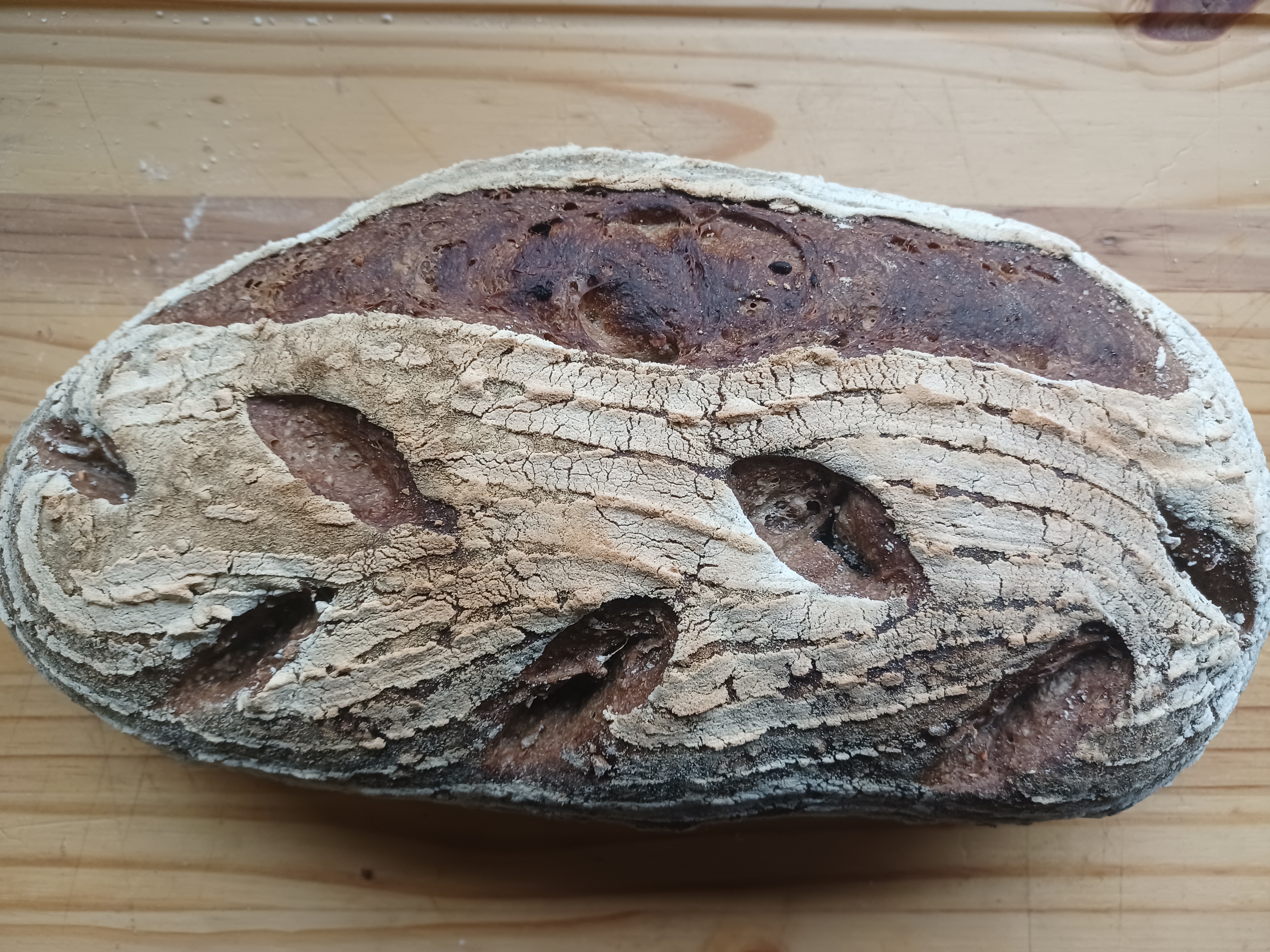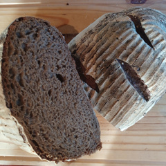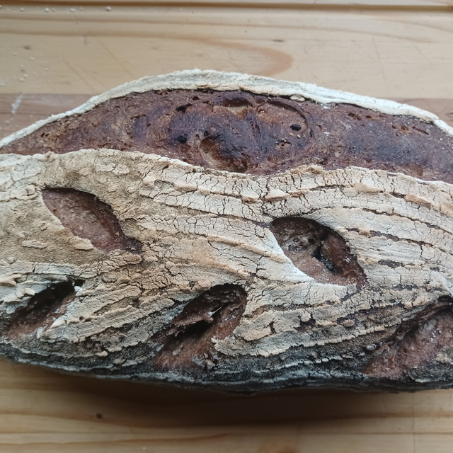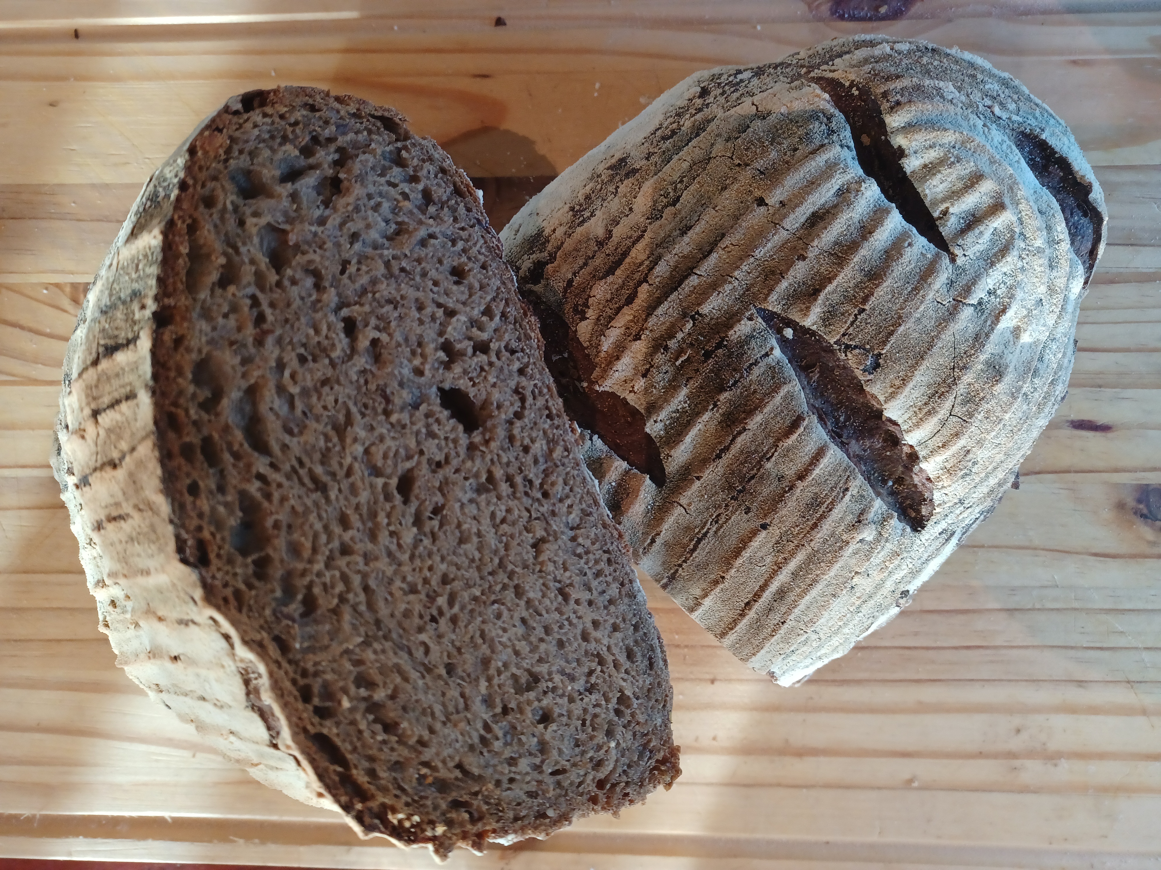 Lang brood, gemaakt aan de hand van een dubbel proces: (1) een voordeeg op basis van tarwe-, rogge- en volkorenmeel dat rijst met desem en (2) een hoofddeeg op basis van het voordeeg, meergranenmeel met zaden en pitten dat verder rijst met desem en gist. Een donker brood met zachte structuur, gebakken op de vloer van de oven.