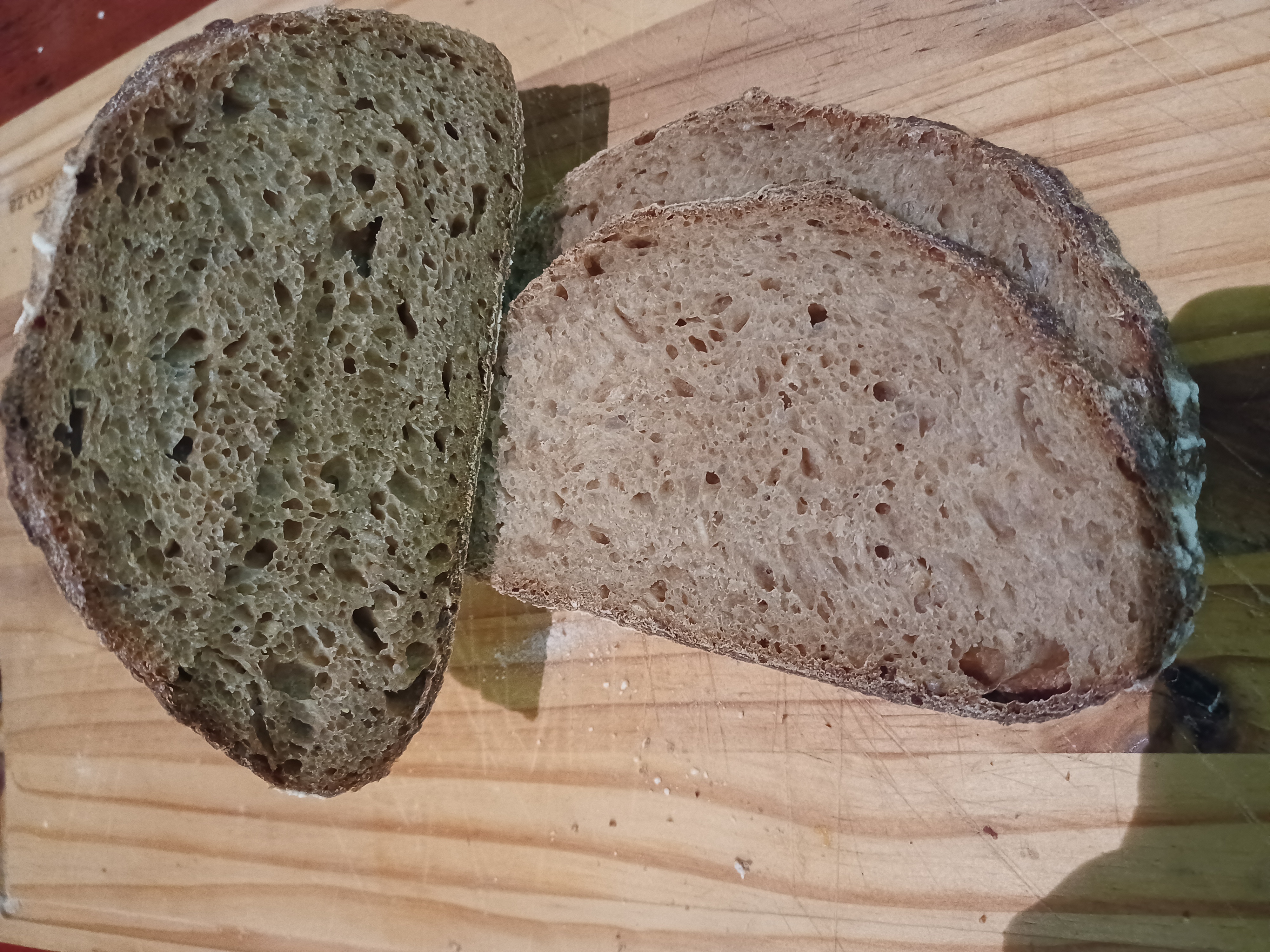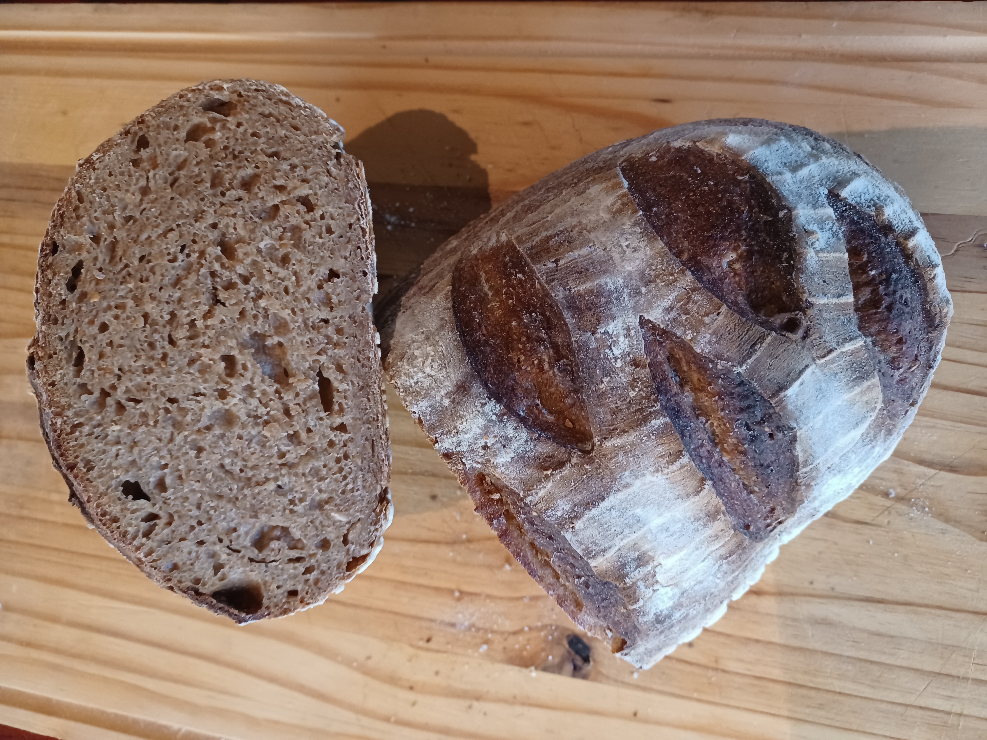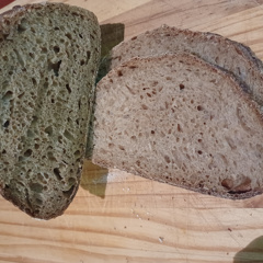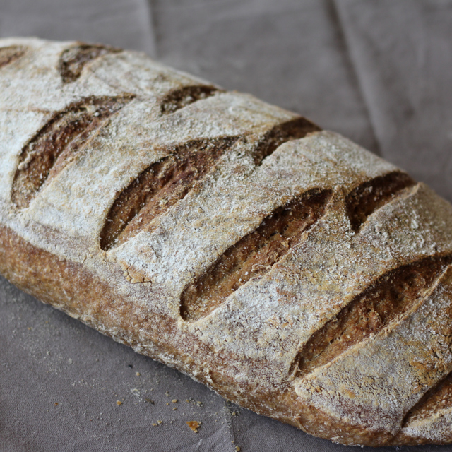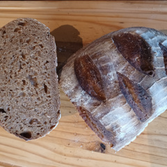 Lang brood op basis van speltmeel, met desem gerezen. Een donker, vast brood, gebakken op de vloer van de oven.